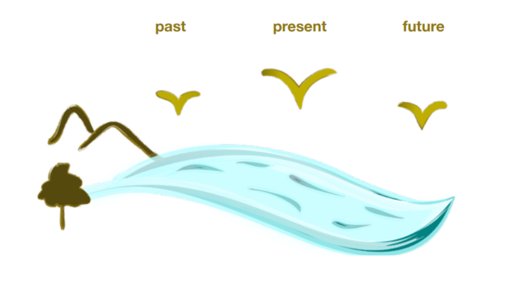 Rivers can be a good metaphor for time and the course of life. A river flows in one direction, from its source to the sea, from cradle to grave, birth to death. Our thoughts and attention are like birds above the river, flying back and forth. We remember good and terrifying things, sorrows but also happy events. Our thoughts also fly into the future, to our worries, what we fear, what we look forward to and long for.